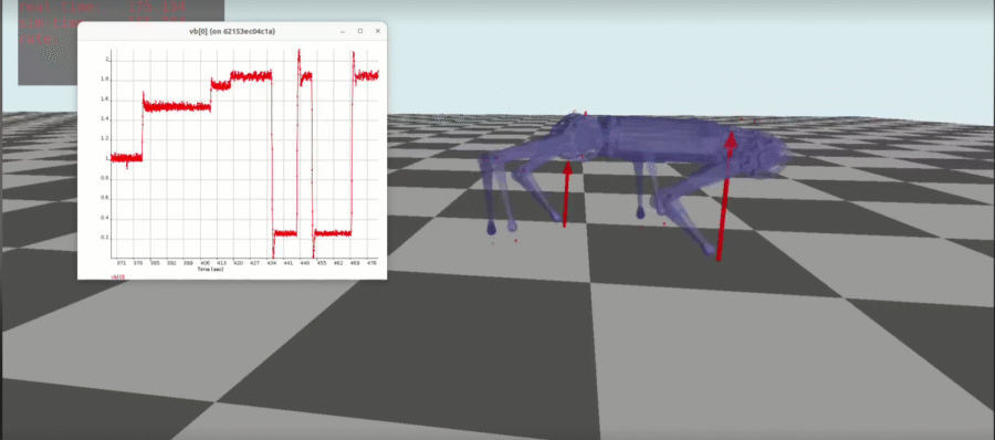 このアプローチでは、従来の歩容である「トロット(trot)」から、より高速な「trotRunning」歩容に切り替えることで、シミュレーション環境にて2.0m/sを記録しました。